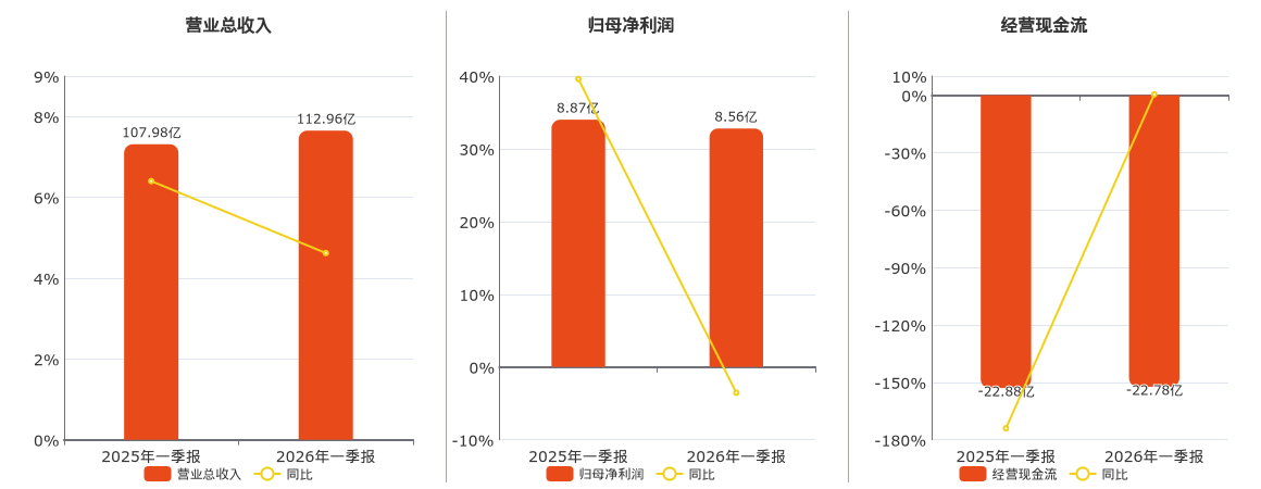 公司营业总收入为112.96亿元,较去年同报告期营业总收入增加4.99亿元,实现5年连续上涨,同比较去年同期上涨4.62%。归母净利润为8.56亿元,较去年同报告期归母净利润减少3149.81万元,同比较去年同期下降3.55%。经营活动现金净流入为-22.78亿元,较去年同报告期经营活动现金净流入增加979.85万元。