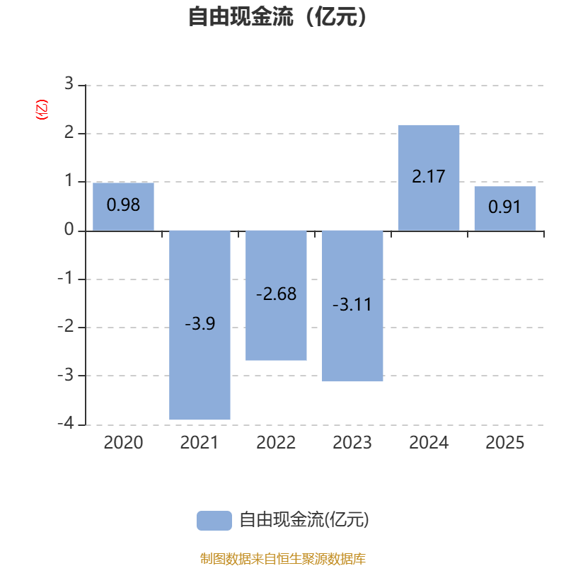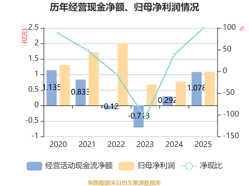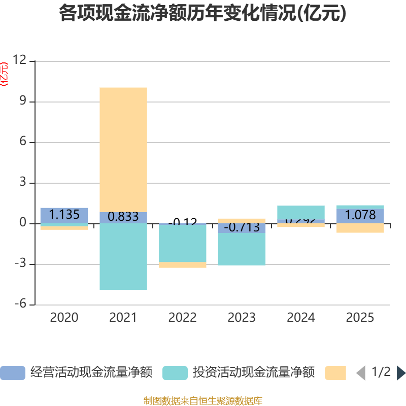 截至2025年,公司经营活动现金流净额为1.08亿元,同比增长269.19%;筹资活动现金流净额-6948.54万元,同比减少4254.37万元;投资活动现金流净额2476.82万元,上年同期为1.01亿元。