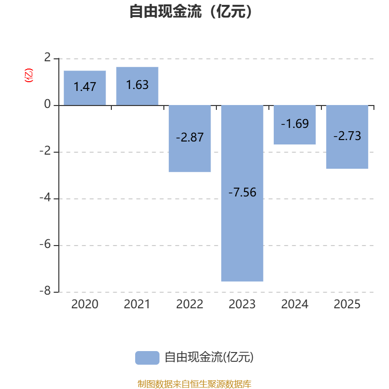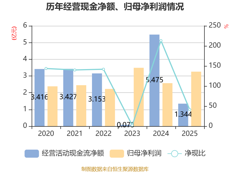 截至2025年,公司经营活动现金流净额为1.34亿元,同比下降75.45%;筹资活动现金流净额5.74亿元,同比增加2798.51万元;投资活动现金流净额-4.93亿元,上年同期为-10.08亿元。
