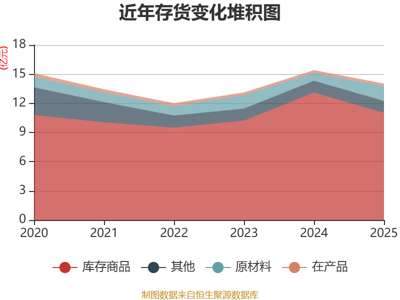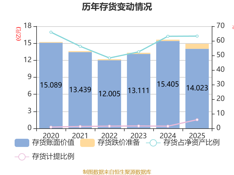 从存货变动来看,截至2025年末,公司存货账面价值为14.02亿元,占净资产的63.25%,较上年末减少1.38亿元。其中,存货跌价准备为8803.38万元,计提比例为5.91%。