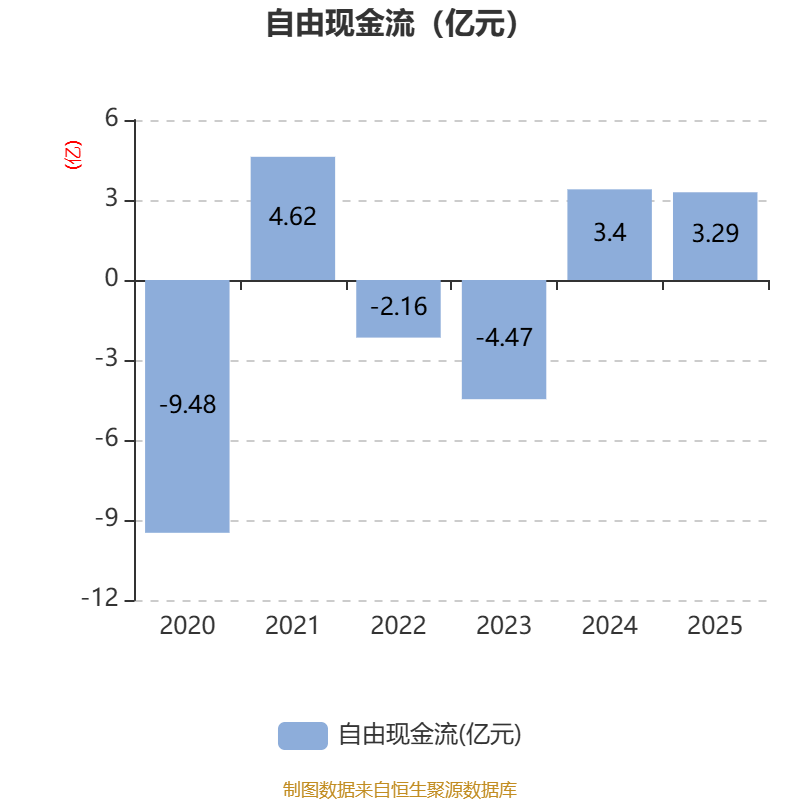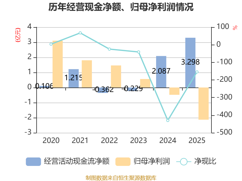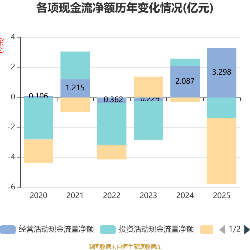 截至2025年,公司经营活动现金流净额为3.3亿元,同比增长58.01%;筹资活动现金流净额-4.41亿元,同比减少4.11亿元;投资活动现金流净额-1.36亿元,上年同期为5007.27万元。