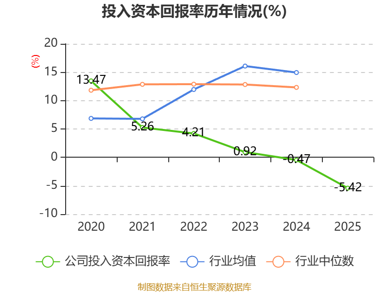数据显示,2025年公司加权平均净资产收益率为-9.17%,较上年同期下降7.21个百分点。公司2025年投入资本回报率为-5.42%,较上年同期下降4.95个百分点。