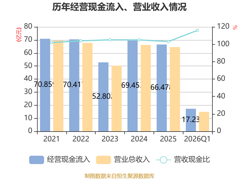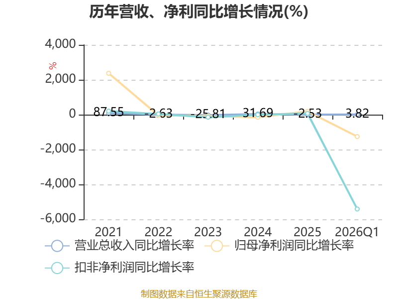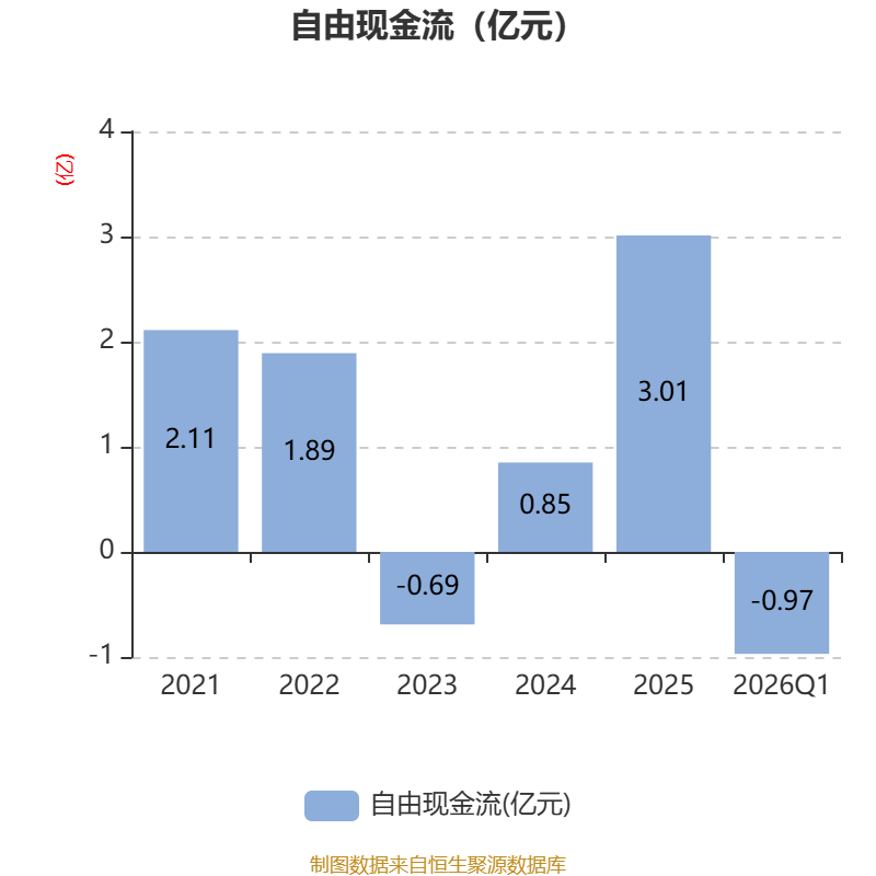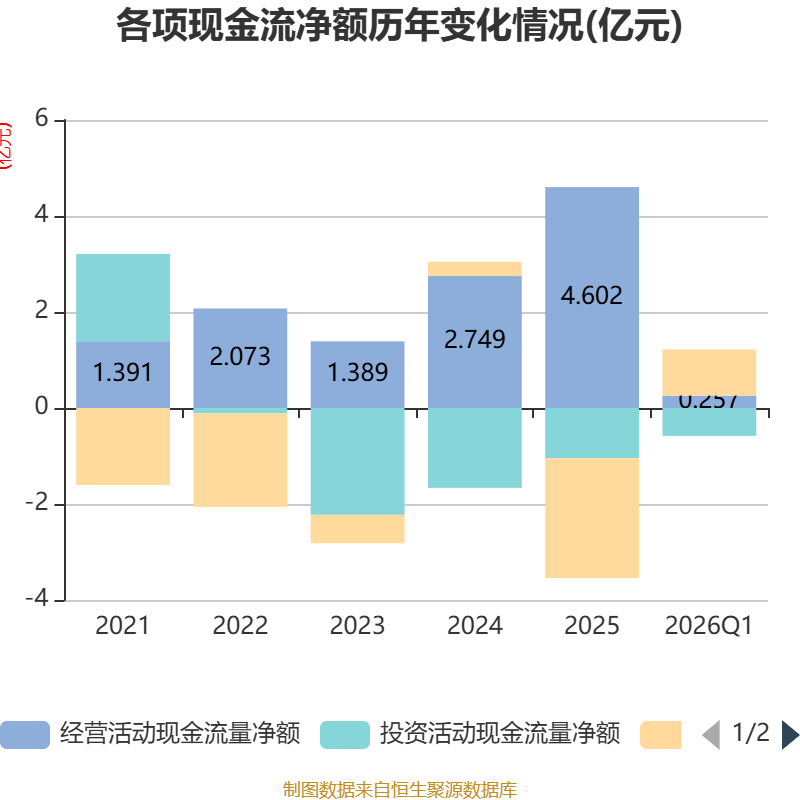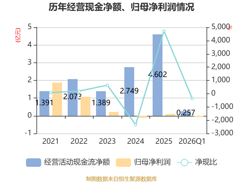 截至2026年一季度末,公司经营活动现金流净额为2571.63万元,同比增长6.08%;筹资活动现金流净额9642.22万元,同比增加5118.92万元;投资活动现金流净额-5810.38万元,上年同期为-3453.82万元。