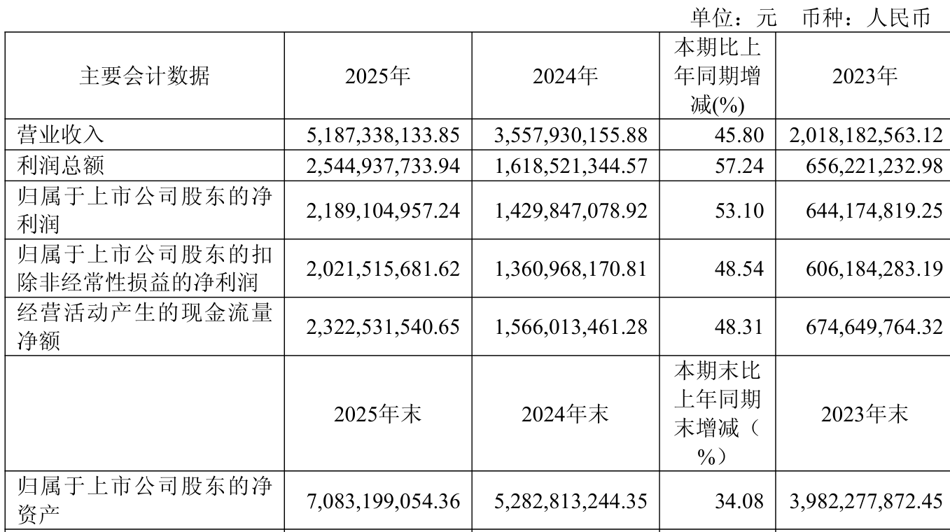 中证智能财讯艾力斯(688578)4月23日披露2025年年度报告。2025年,公司实现营业总收入51.87亿元,同比增长45.80%;归母净利润21.89亿元,同比增长53.10%;扣非净利润20.22亿元,同比增长48.54%;经营活动产生的现金流量净额为23.23亿元,同比增长48.31%;报告期内,艾力斯基本每股收益为4.86元,加权平均净资产收益率为35.40%。公司2025年度分配预案为:拟向全体股东每10股派现6元(含税)。