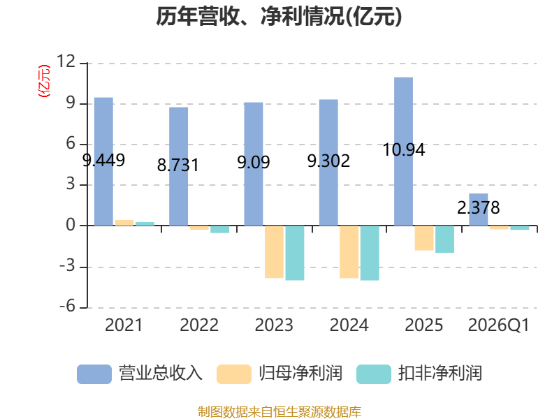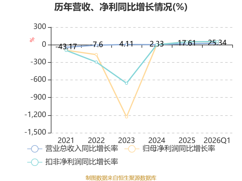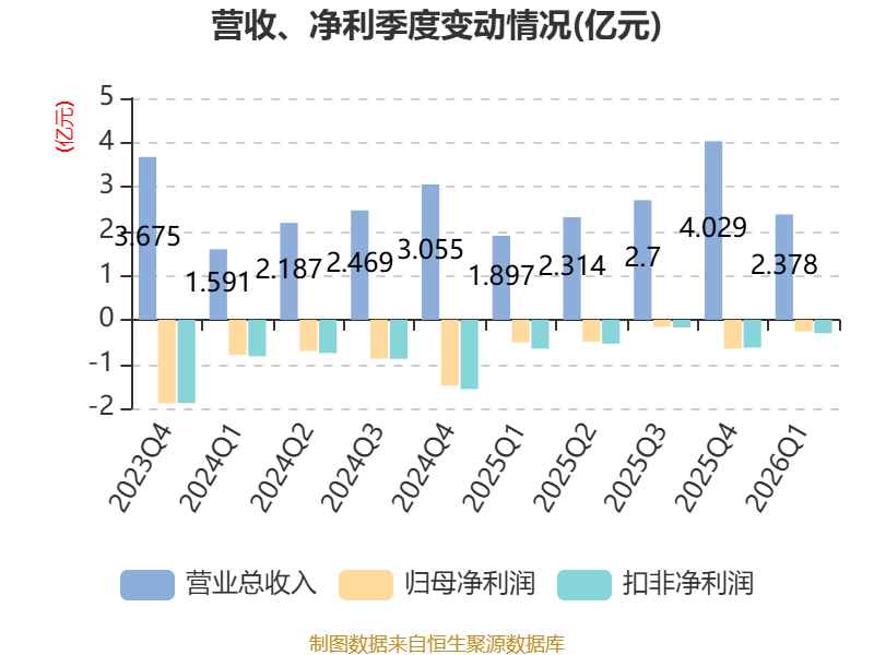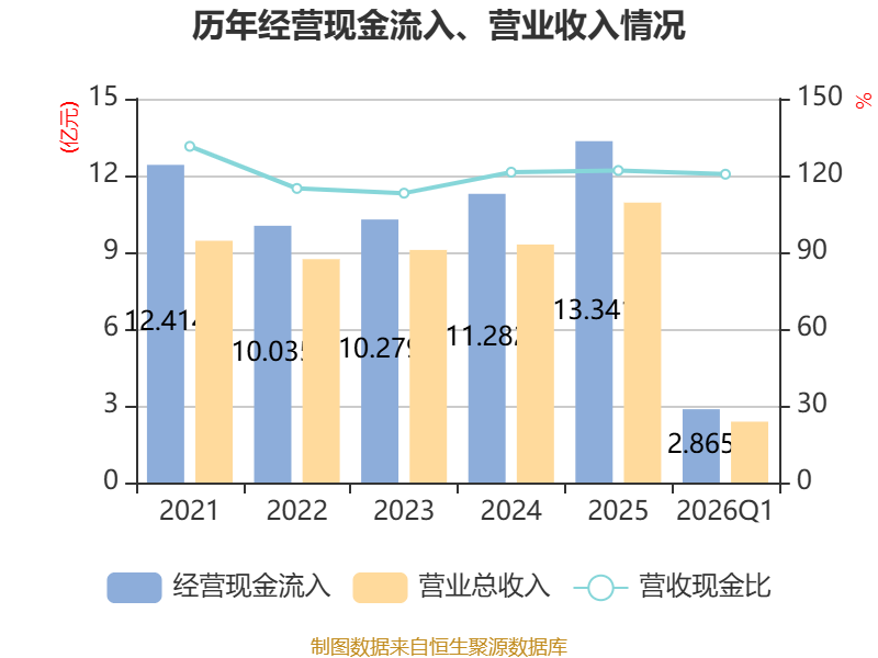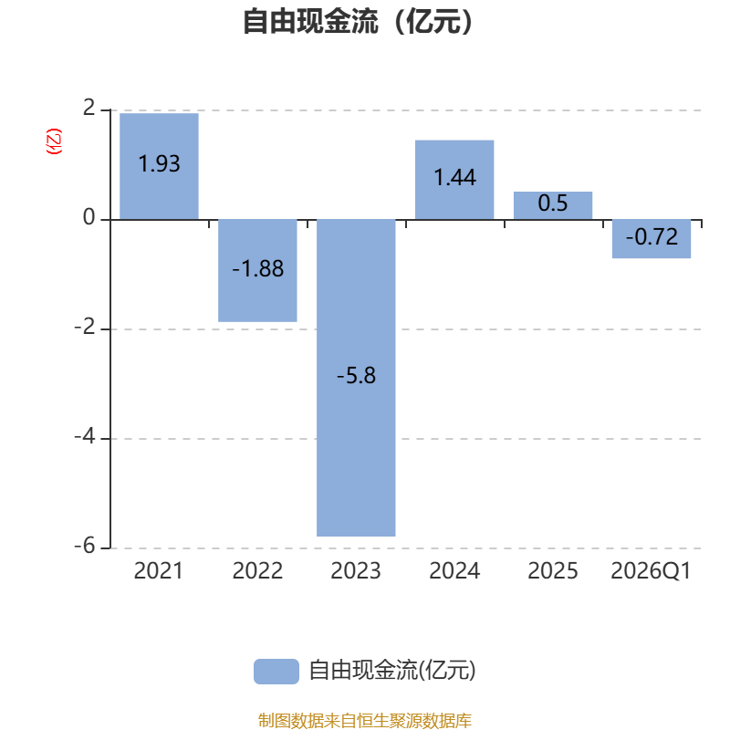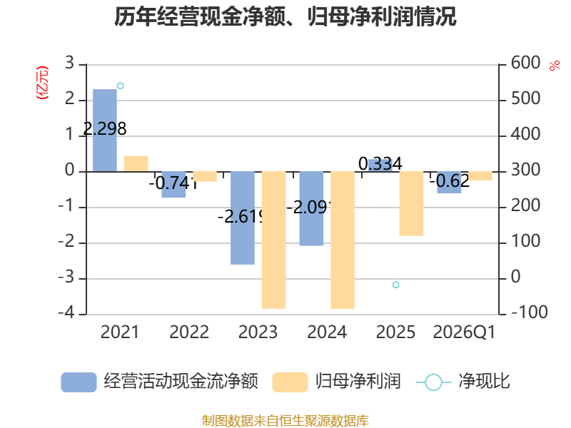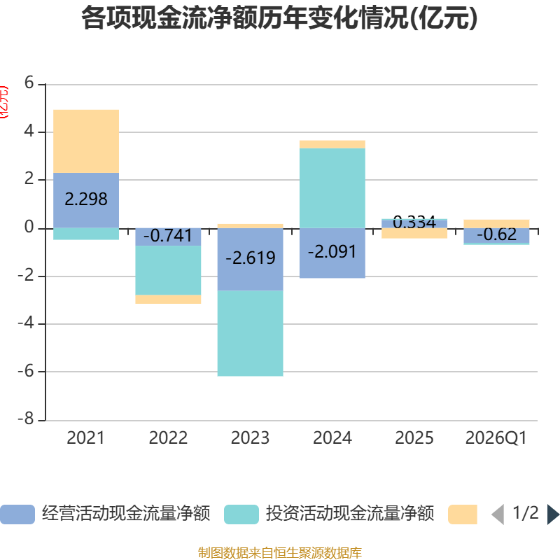 截至2026年一季度末,公司经营活动现金流净额为-6197.71万元,同比减少1750.04万元;筹资活动现金流净额3486.15万元,同比减少659.71万元;投资活动现金流净额-792.29万元,上年同期为-2.03亿元。