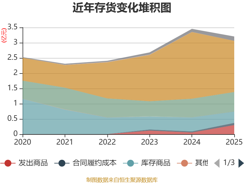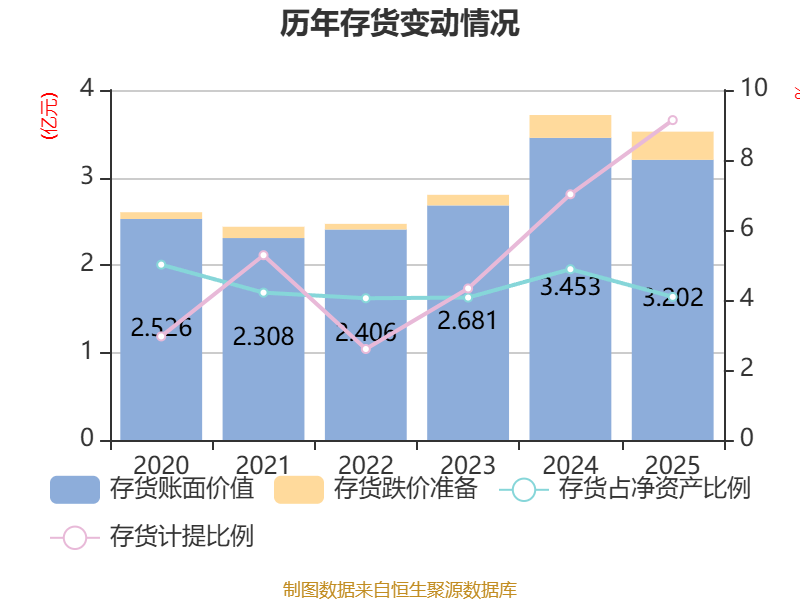 从存货变动来看,截至2025年末,公司存货账面价值为3.2亿元,占净资产的4.09%,较上年末减少2504.14万元。其中,存货跌价准备为3220.55万元,计提比例为9.14%。