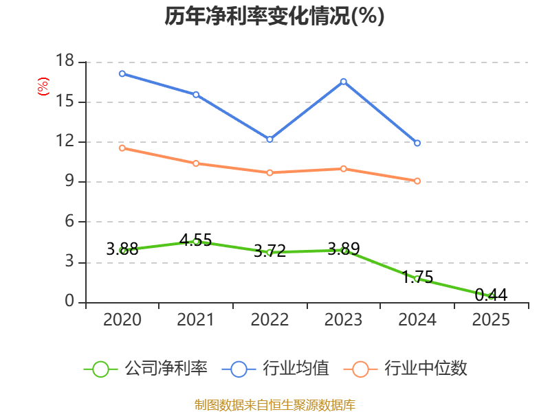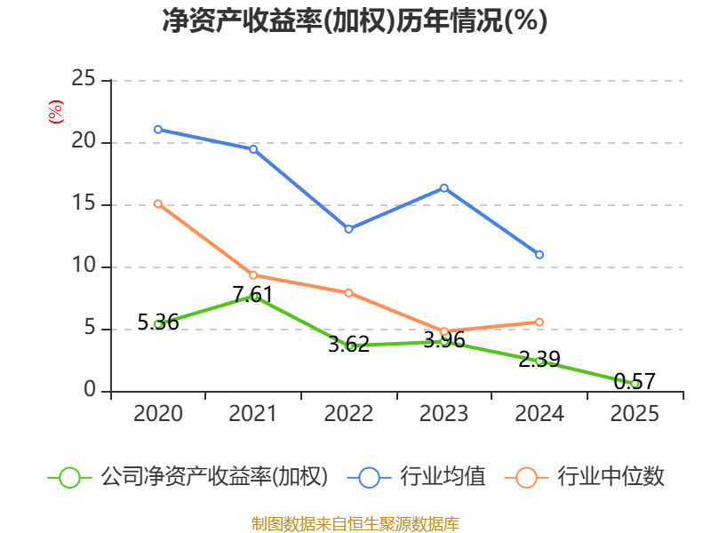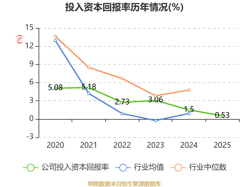 数据显示,2025年公司加权平均净资产收益率为0.57%,较上年同期下降1.82个百分点。公司2025年投入资本回报率为0.53%,较上年同期下降0.97个百分点。