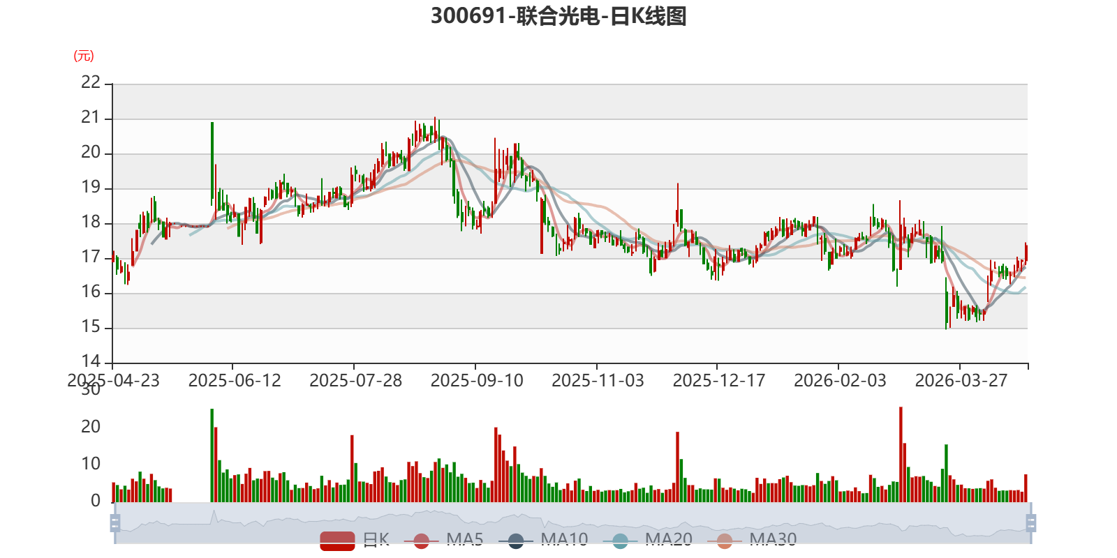 值得注意的是,中登公司数据显示,截至2026年4月17日,联合光电13.33%股份处于质押状态。年报显示,第一大股东龚俊强质押2569万股公司股份,占其全部持股的53.8%;第四大股东刘鸿质押666.8万股公司股份,占其全部持股的49.39%;第三大股东邱盛平质押350万股公司股份,占其全部持股的21.16%。
