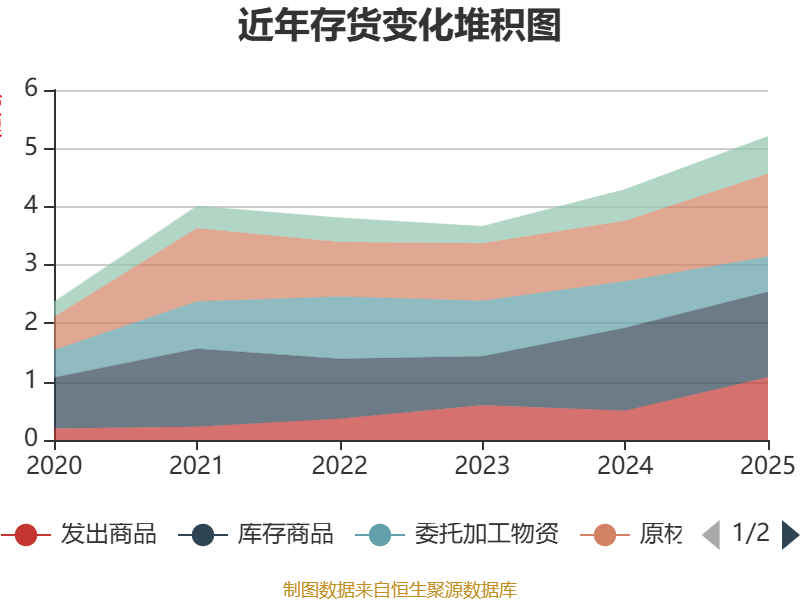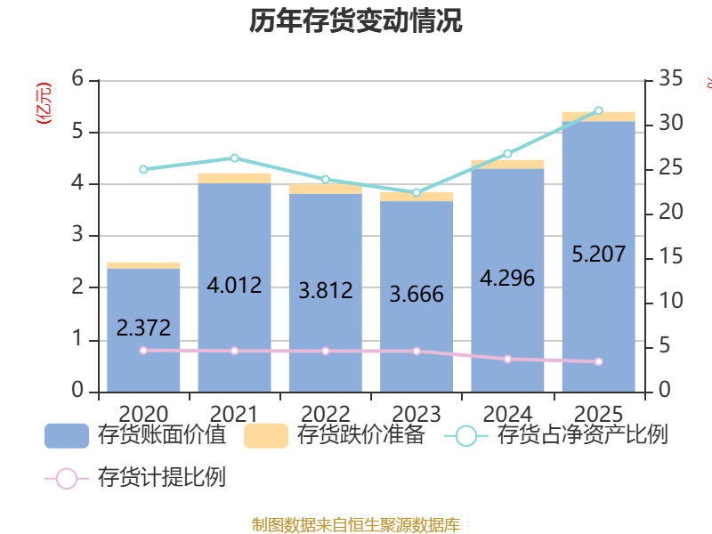 从存货变动来看,截至2025年末,公司存货账面价值为5.21亿元,占净资产的31.57%,较上年末增加9113.31万元。其中,存货跌价准备为1809万元,计提比例为3.36%。