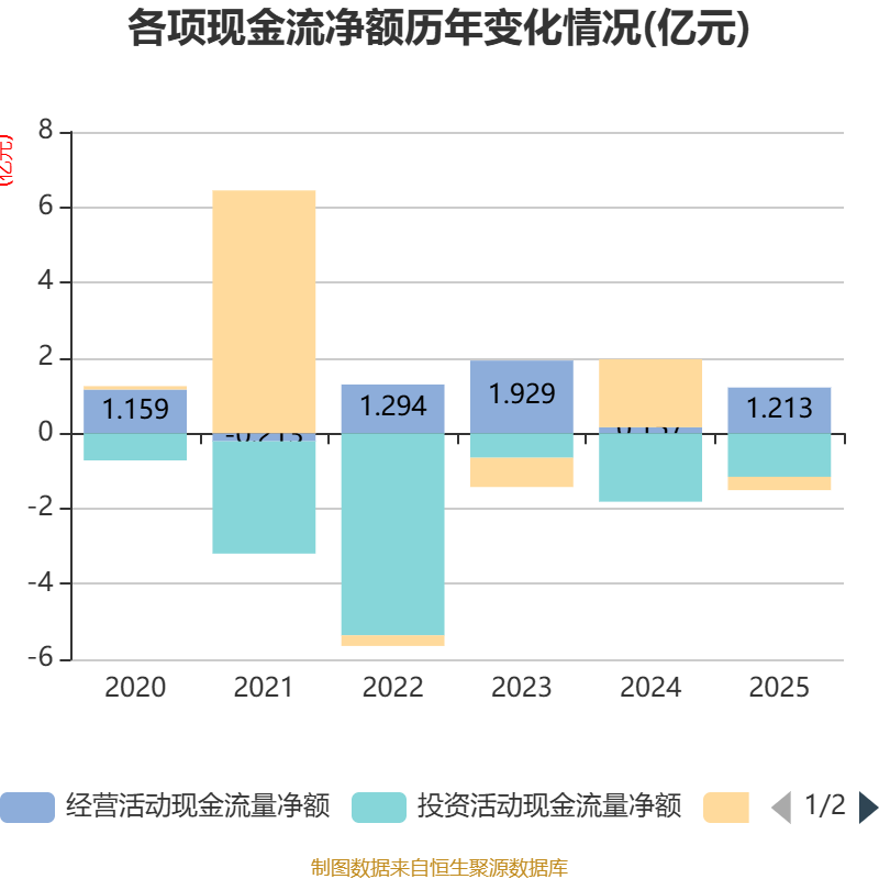 截至2025年,公司经营活动现金流净额为1.21亿元,同比增长673.99%;筹资活动现金流净额-3543.03万元,同比减少2.16亿元;投资活动现金流净额-1.16亿元,上年同期为-1.82亿元。