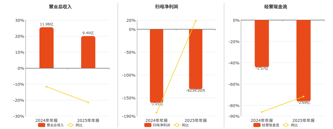 公司营业总收入为9.40亿元,在已披露的同业公司中排名第50,较去年同报告期营业总收入减少2.58亿元,同比较去年同期下降21.54%。归母净利润为-8239.20万元,在已披露的同业公司中排名第64。经营活动现金净流入为-2.69亿元,在已披露的同业公司中排名第78,较去年同报告期经营活动现金净流入减少1.12亿元。