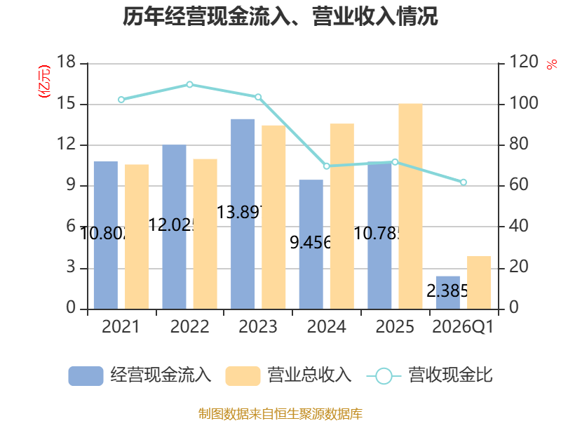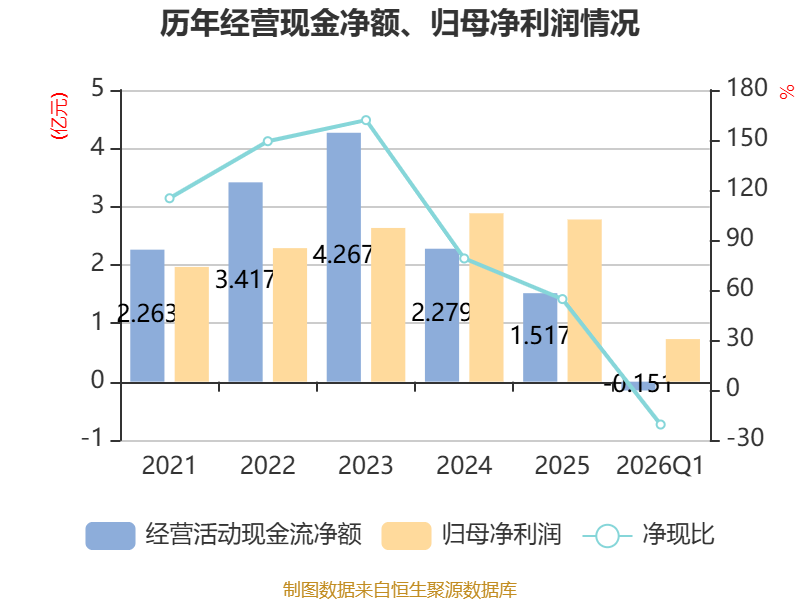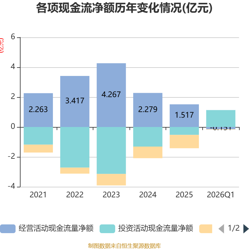 截至2026年一季度末,公司经营活动现金流净额为-1513.19万元,同比减少6982.28万元;筹资活动现金流净额-268.48万元,同比减少268.48万元;投资活动现金流净额1.13亿元,上年同期为-8631.52万元。