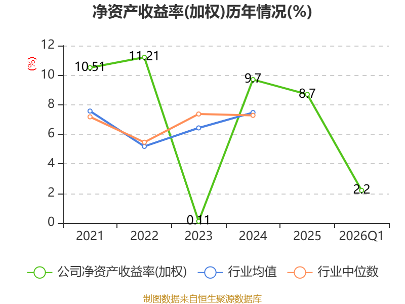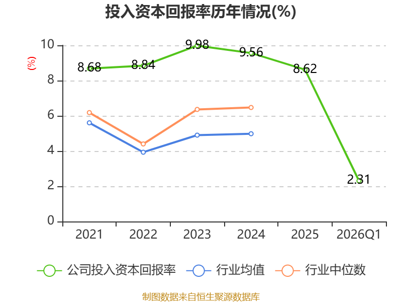 盈利能力方面, 2026年一季度公司加权平均净资产收益率为2.2%,同比下降0.02个百分点。公司2026年第一季度投入资本回报率为2.31%,较上年同期上升0.11个百分点。