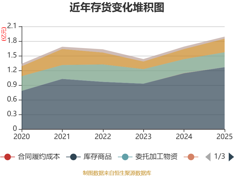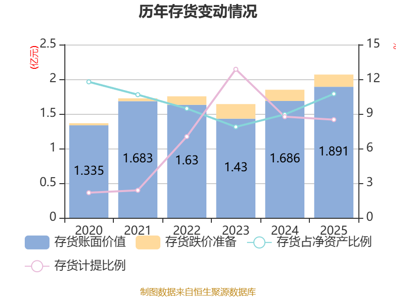 从存货变动来看,截至2025年末,公司存货账面价值为1.89亿元,占净资产的10.73%,较上年末增加2044.11万元。其中,存货跌价准备为1757.34万元,计提比例为8.5%。
