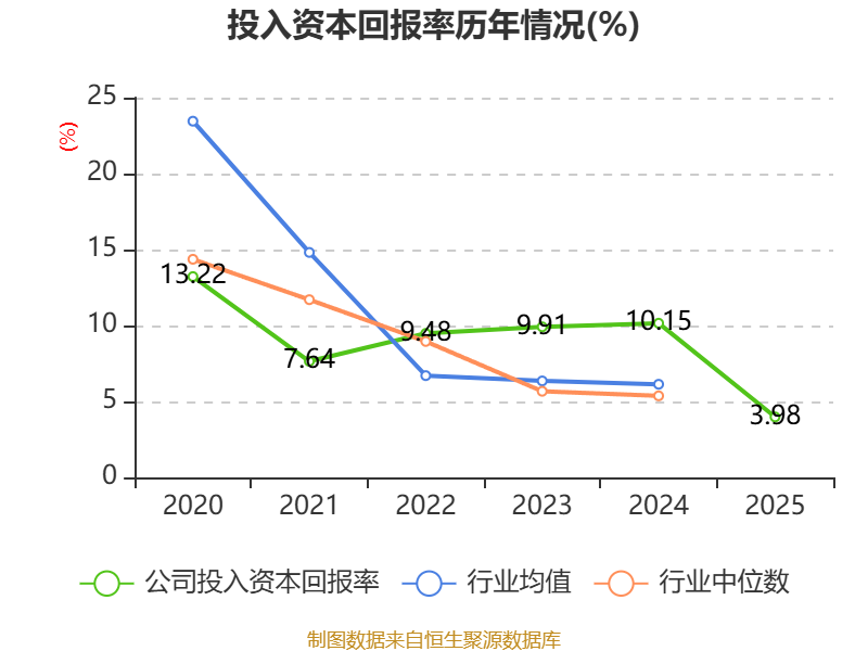 数据显示,2025年公司加权平均净资产收益率为4.13%,较上年同期下降7.71个百分点。公司2025年投入资本回报率为3.98%,较上年同期下降6.17个百分点。