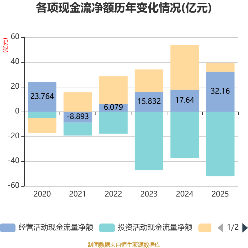 截至2025年,公司经营活动现金流净额为32.16亿元,同比增长82.31%;筹资活动现金流净额7.18亿元,同比减少28.81亿元;投资活动现金流净额-52.12亿元,上年同期为-37.48亿元。