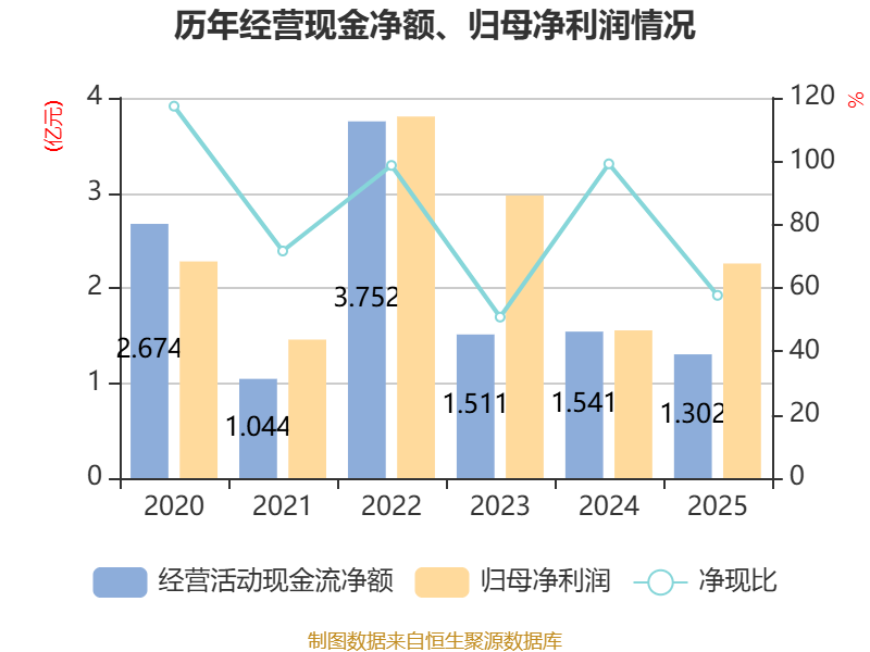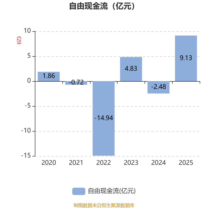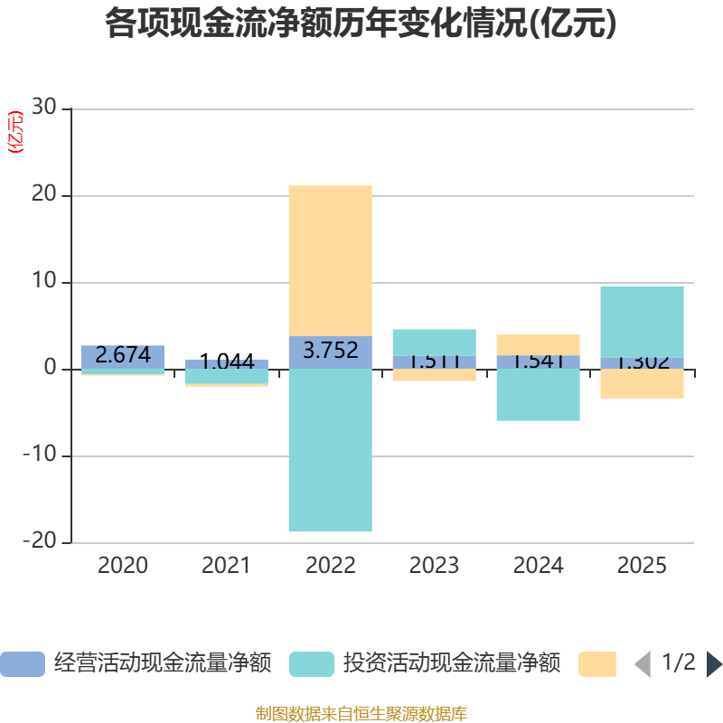 截至2025年,公司经营活动现金流净额为1.3亿元,同比下降15.52%;筹资活动现金流净额-3.43亿元,同比减少5.83亿元;投资活动现金流净额8.19亿元,上年同期为-6.01亿元。