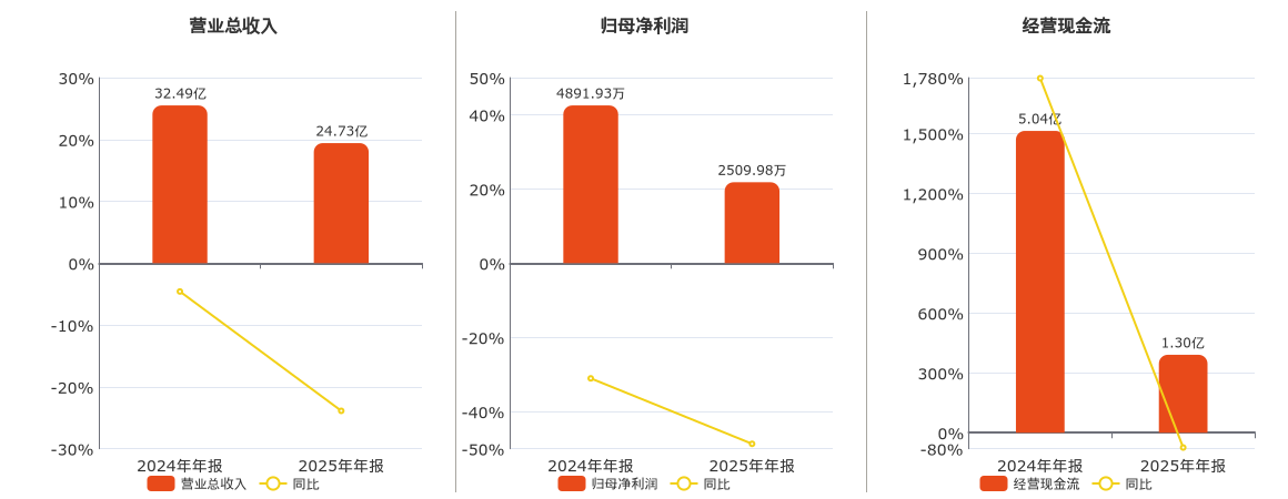 公司营业总收入为24.73亿元,在已披露的同业公司中排名第6,较去年同报告期营业总收入减少7.76亿元,同比较去年同期下降23.88%。归母净利润为2509.98万元,在已披露的同业公司中排名第5,较去年同报告期归母净利润减少2381.95万元,同比较去年同期下降48.69%。经营活动现金净流入为1.30亿元,在已披露的同业公司中排名第5,较去年同报告期经营活动现金净流入减少3.74亿元,同比较去年同期下降74.17%。