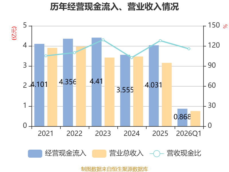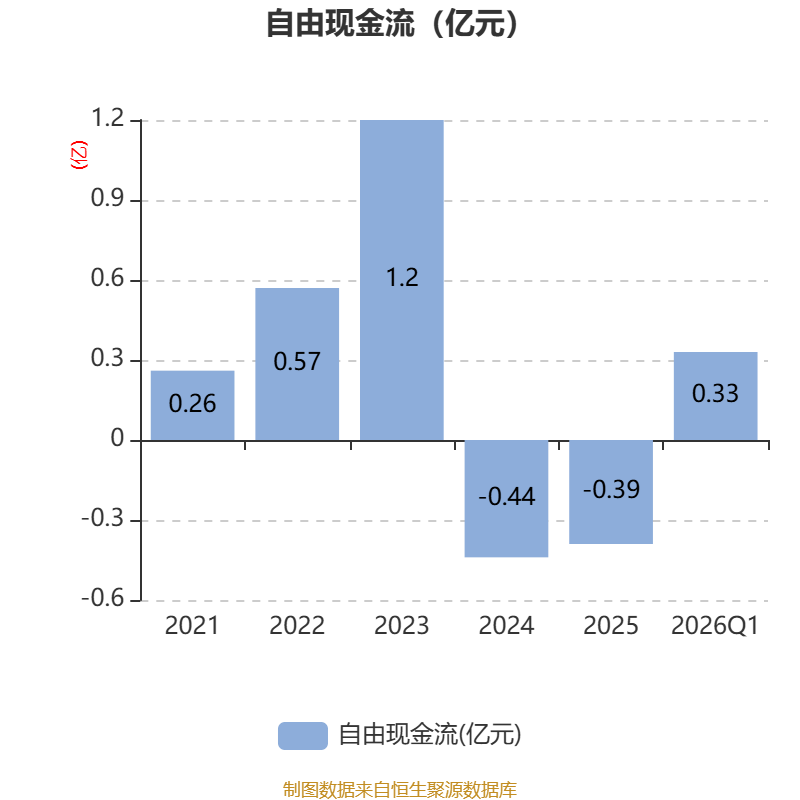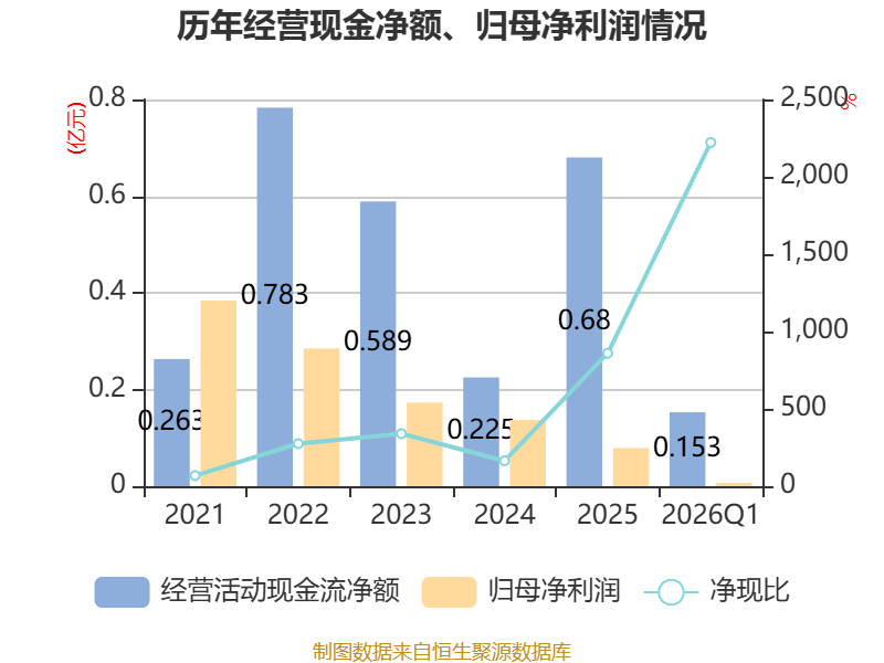截至2026年一季度末,公司经营活动现金流净额为1529.96万元,同比增加3130.77万元;筹资活动现金流净额-1159.08万元,同比减少3408.1万元;投资活动现金流净额1755.58万元,上年同期为-267万元。