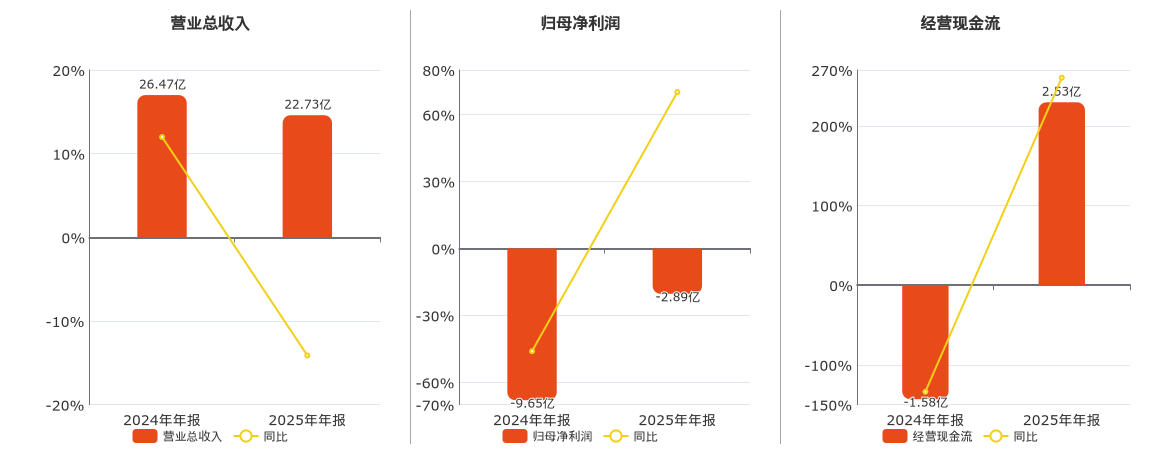 公司营业总收入为22.73亿元,较去年同报告期营业总收入减少3.74亿元,同比较去年同期下降14.12%。归母净利润为-2.89亿元,在已披露的同业公司中排名第74。经营活动现金净流入为2.53亿元。