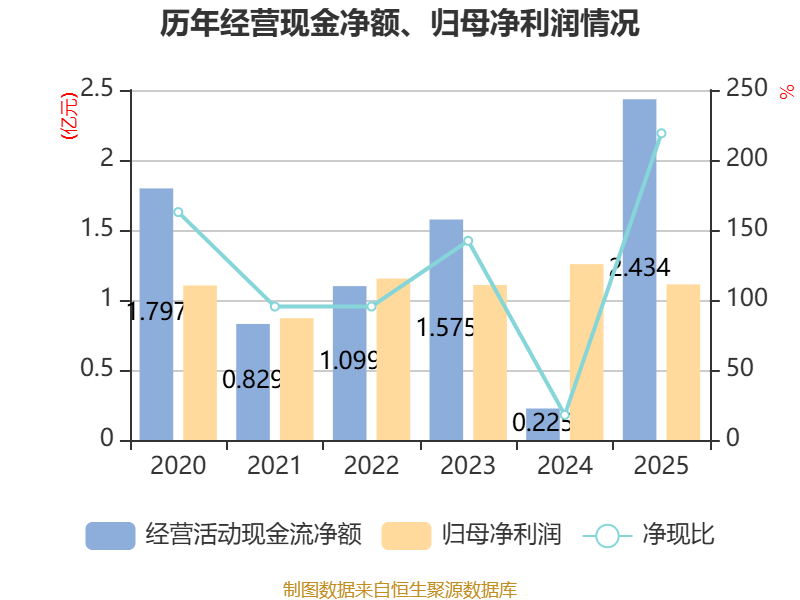 截至2025年,公司经营活动现金流净额为2.43亿元,同比增长982.63%;筹资活动现金流净额-6496.96万元,同比减少1006.91万元;投资活动现金流净额-7585.27万元,上年同期为-1.31亿元。