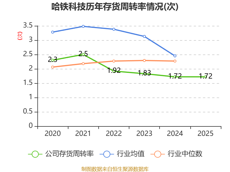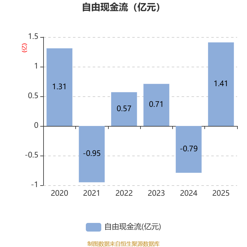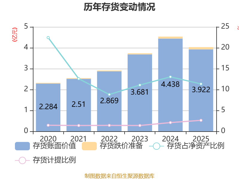 从存货变动来看,截至2025年末,公司存货账面价值为3.92亿元,占净资产的11.33%,较上年末减少5156.43万元。其中,存货跌价准备为1056.43万元,计提比例为2.62%。