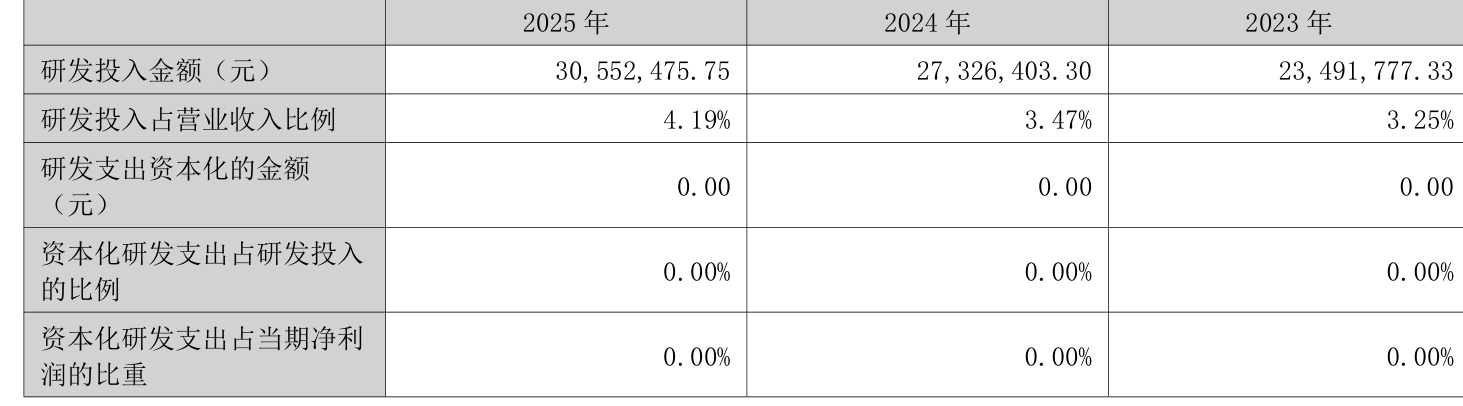 2025年全年,公司研发投入金额为3055.25万元,同比增长11.81%;研发投入占营业收入比例为4.19%,相比上年同期上升0.72个百分点。此外,公司全年研发投入资本化率为0%。