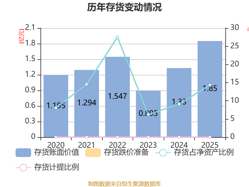 从存货变动来看,截至2025年末,公司存货账面价值为1.85亿元,占净资产的14.32%,较上年末增加5199.66万元。公司本期没有计提存货跌价准备。