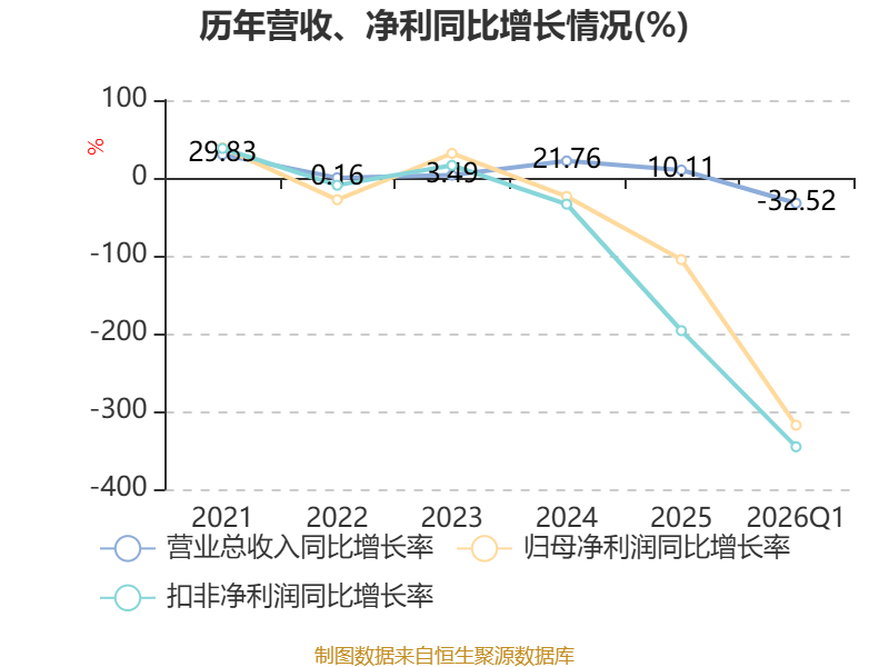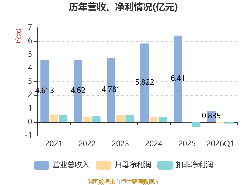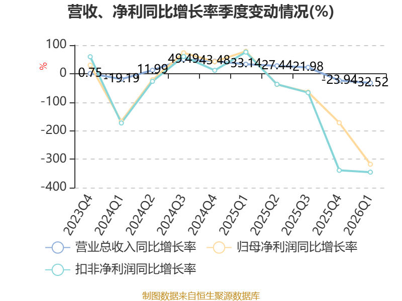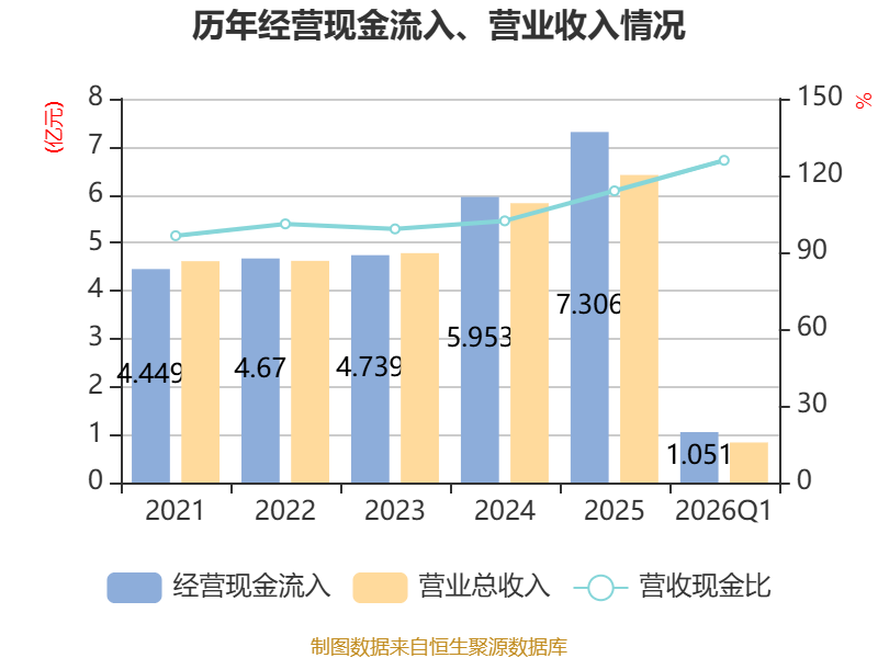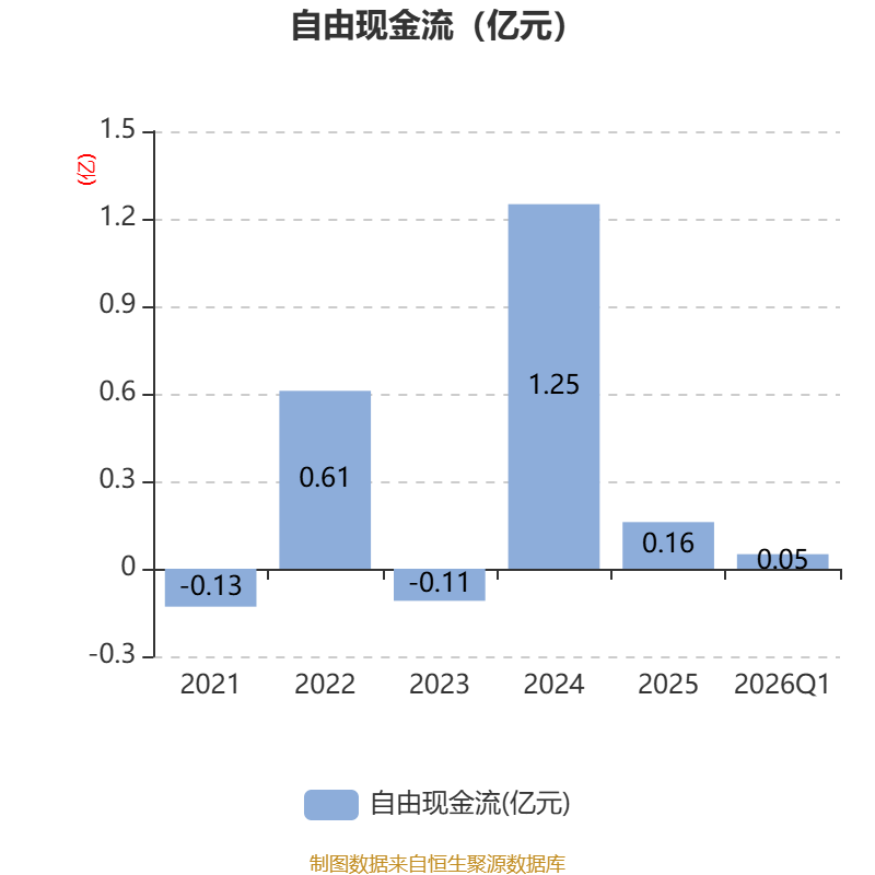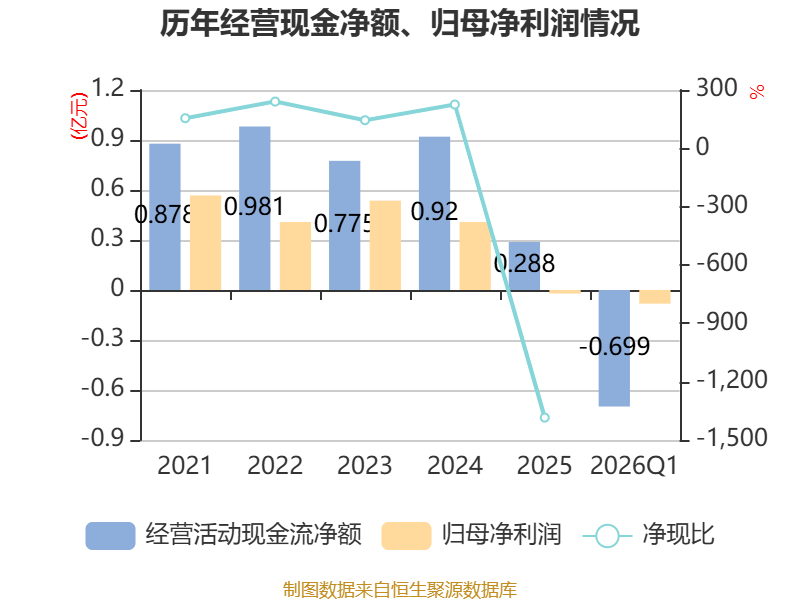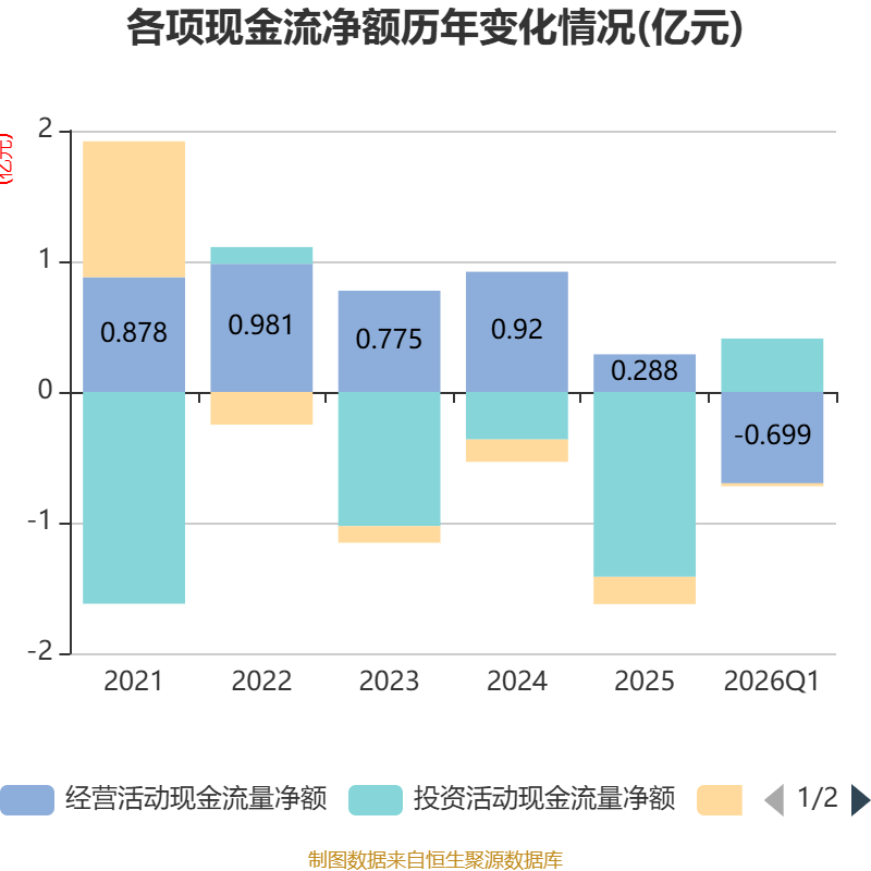 截至2026年一季度末,公司经营活动现金流净额为-6993.75万元,同比减少1084.35万元;筹资活动现金流净额-216.49万元,同比增加269.84万元;投资活动现金流净额4093.52万元,上年同期为-885.27万元。