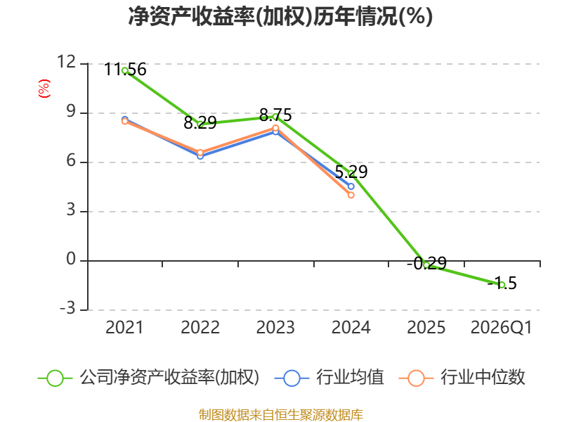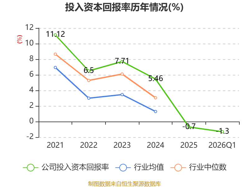 盈利能力方面, 2026年一季度公司加权平均净资产收益率为-1.5%,同比下降1.17个百分点。公司2026年第一季度投入资本回报率为-1.3%,较上年同期下降0.93个百分点。