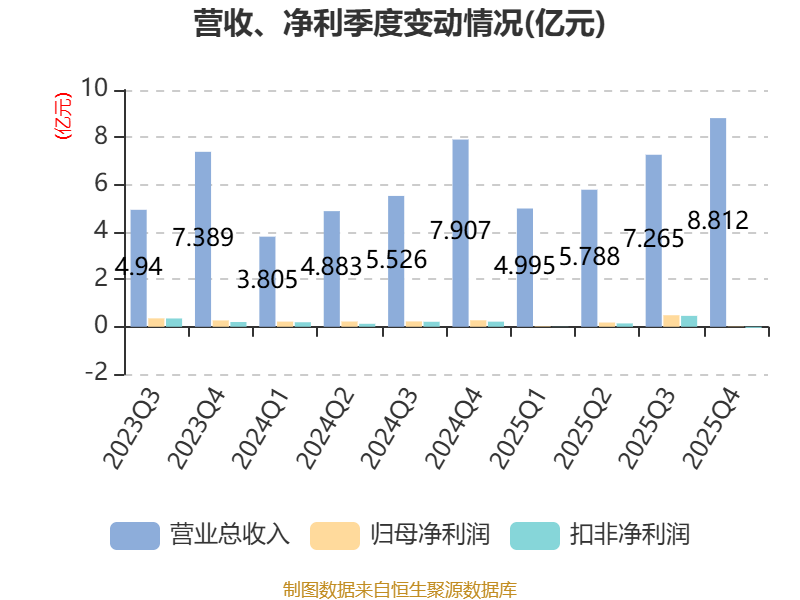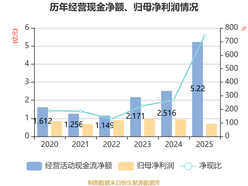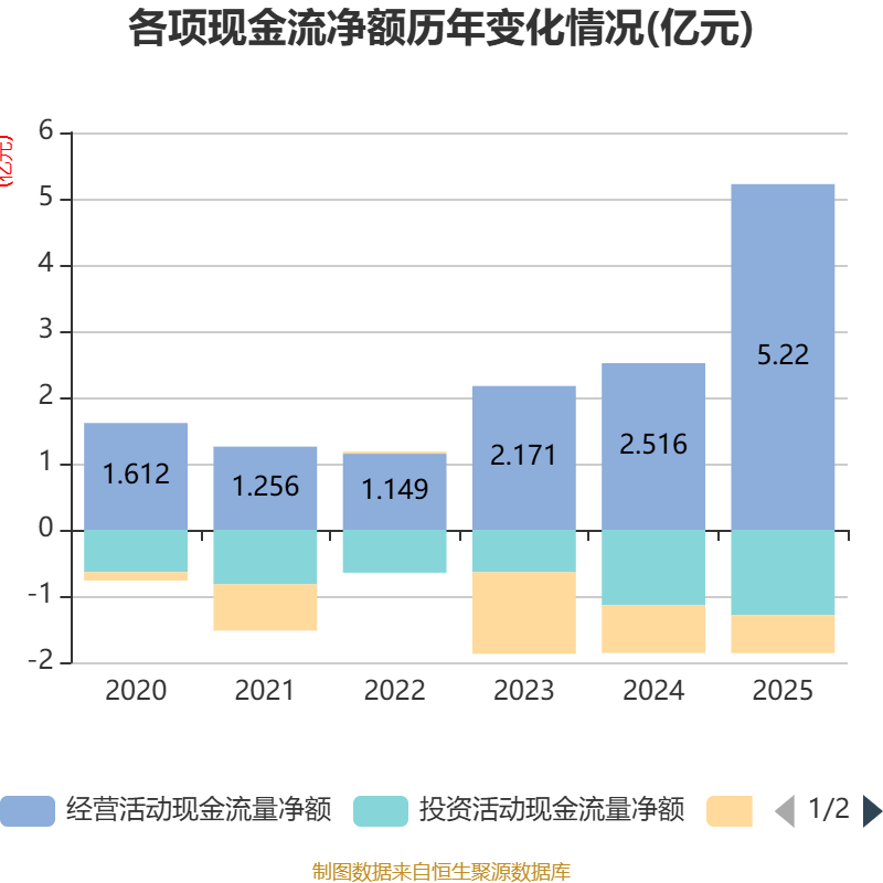 截至2025年,公司经营活动现金流净额为5.22亿元,同比增长107.5%;筹资活动现金流净额-5751.84万元,同比增加1441.91万元;投资活动现金流净额-1.29亿元,上年同期为-1.14亿元。