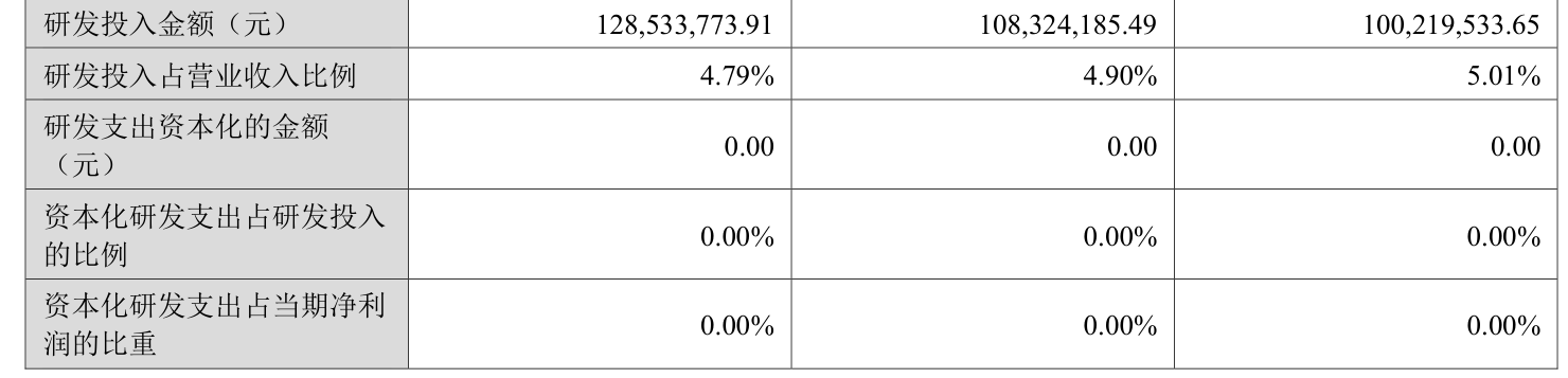 2025年全年,公司研发投入金额为1.29亿元,同比增长18.66%;研发投入占营业收入比例为4.79%,相比上年同期下降0.11个百分点。此外,公司全年研发投入资本化率为0%。