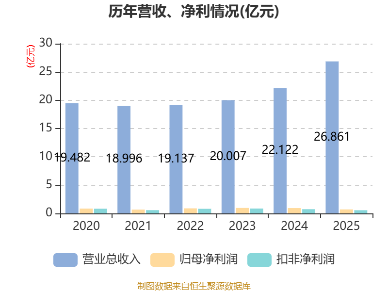 中证智能财讯凯发电气(300407)4月23日披露2025年年度报告。2025年,公司实现营业总收入26.86亿元,同比增长21.42%;归母净利润7039.3万元,同比下降25.03%;扣非净利润5620.33万元,同比下降24.33%;经营活动产生的现金流量净额为5.22亿元,同比增长107.50%;报告期内,凯发电气基本每股收益为0.22元,加权平均净资产收益率为3.79%。公司2025年度分配预案为:拟向全体股东每10股派现0.8元(含税)。