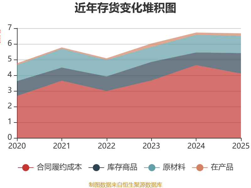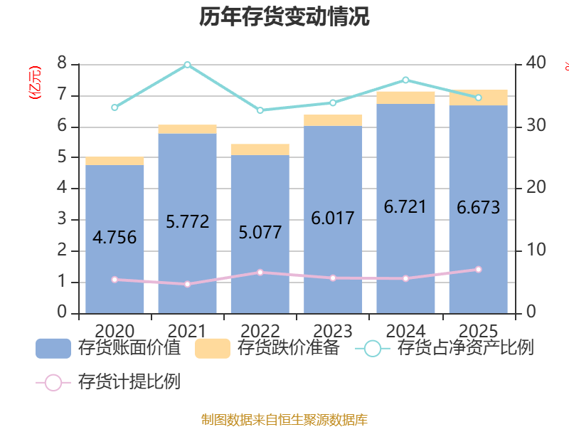 从存货变动来看,截至2025年末,公司存货账面价值为6.67亿元,占净资产的34.6%,较上年末减少471.68万元。其中,存货跌价准备为5038.3万元,计提比例为7.02%。
