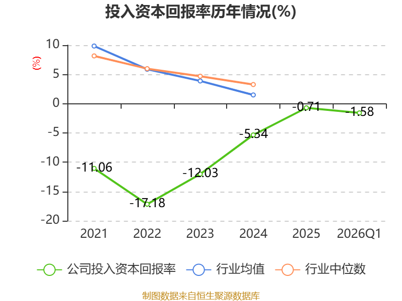 盈利能力方面, 2026年一季度公司加权平均净资产收益率为-3.08%,同比下降5.11个百分点。公司2026年第一季度投入资本回报率为-1.58%,较上年同期下降3.49个百分点。