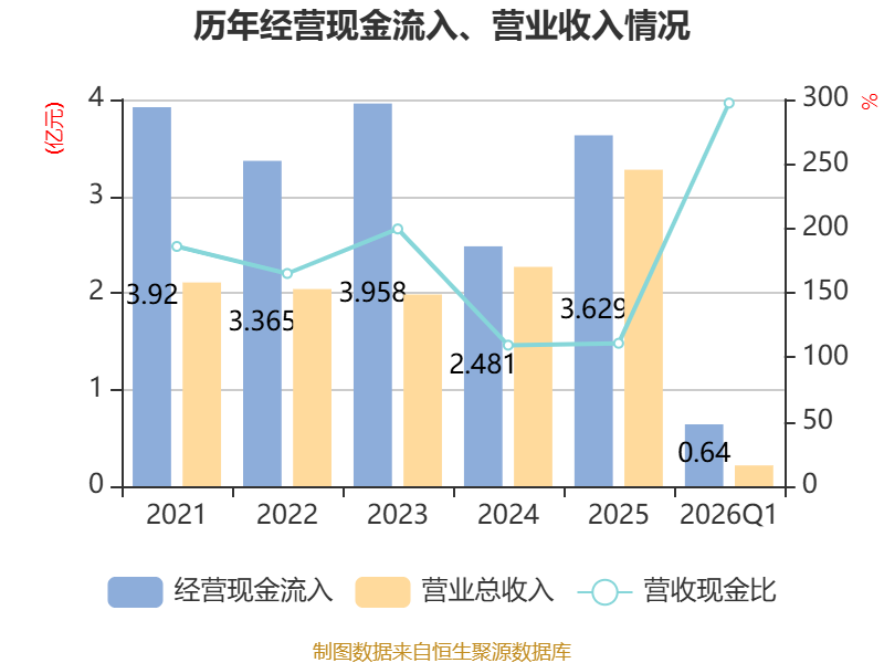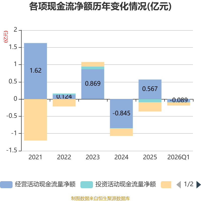 截至2026年一季度末,公司经营活动现金流净额为-893.61万元,同比减少348.07万元;筹资活动现金流净额-875.98万元,同比减少778.74万元;投资活动现金流净额-111.67万元,上年同期为-78.84万元。