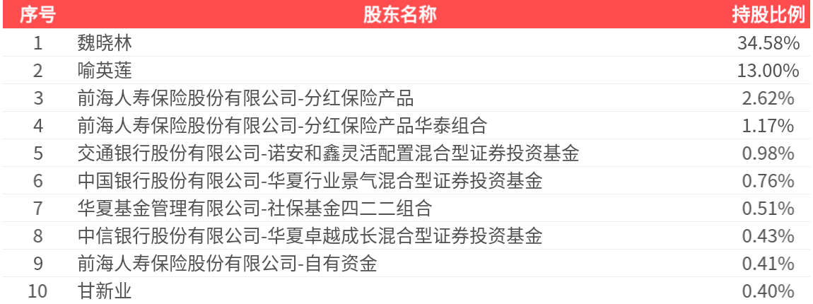 公司股东户数为2.34万户,前十大股东持股数量为1.68亿股,占总股本比例为54.87%,前十大股东持股情况如下: