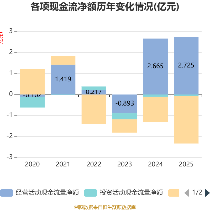 截至2025年,公司经营活动现金流净额为2.72亿元,同比增长2.25%;筹资活动现金流净额-2.27亿元,同比减少1.07亿元;投资活动现金流净额-650.9万元,上年同期为-1085.91万元。