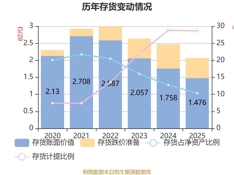 从存货变动来看,截至2025年末,公司存货账面价值为1.48亿元,占净资产的10.34%,较上年末减少2816.43万元。其中,存货跌价准备为5922.71万元,计提比例为28.64%。