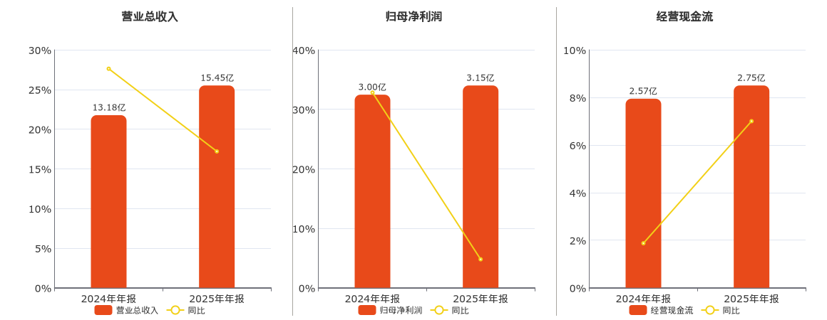 公司营业总收入为15.45亿元,在已披露的同业公司中排名第7。归母净利润为3.15亿元。经营活动现金净流入为2.75亿元。