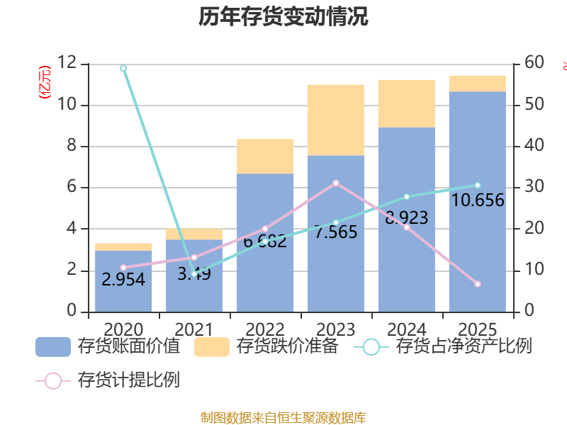 从存货变动来看,截至2025年末,公司存货账面价值为10.66亿元,占净资产的30.59%,较上年末增加1.73亿元。其中,存货跌价准备为7648.09万元,计提比例为6.7%。