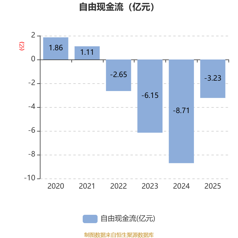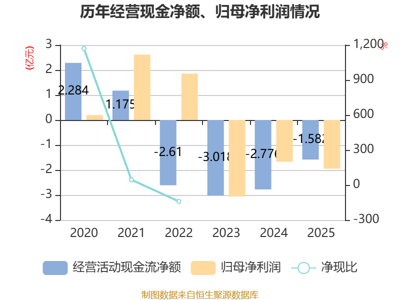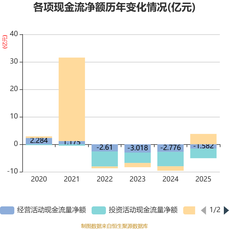 截至2025年,公司经营活动现金流净额为-1.58亿元,同比增加1.19亿元;筹资活动现金流净额3.77亿元,同比增加5.39亿元;投资活动现金流净额-3.49亿元,上年同期为-5.23亿元。