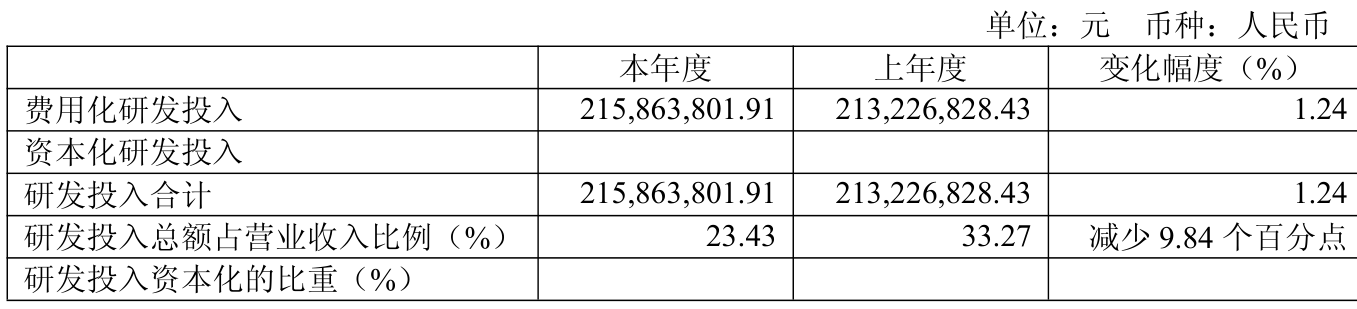 2025年全年,公司研发投入金额为2.16亿元,同比增长1.24%;研发投入占营业收入比例为23.43%,相比上年同期下降9.84个百分点。