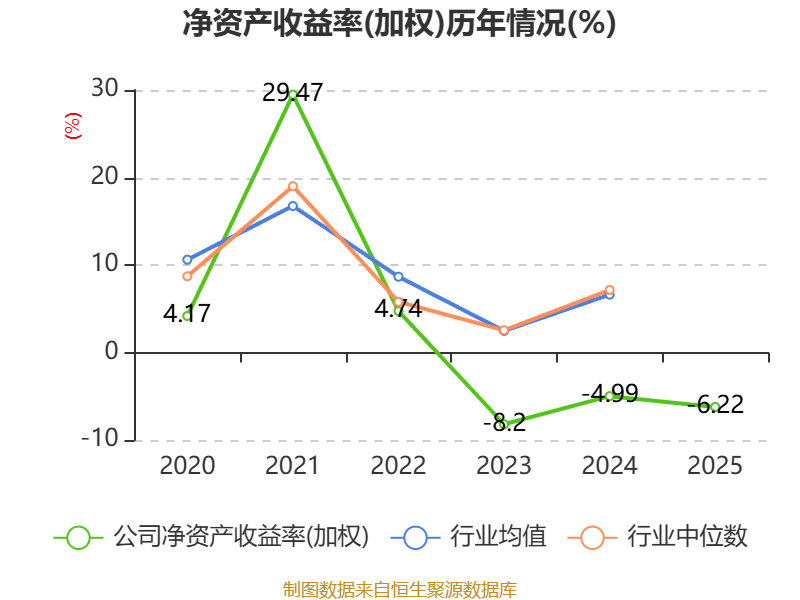数据显示,2025年公司加权平均净资产收益率为-6.22%,较上年同期下降1.23个百分点。公司2025年投入资本回报率为-6.16%,较上年同期下降0.77个百分点。