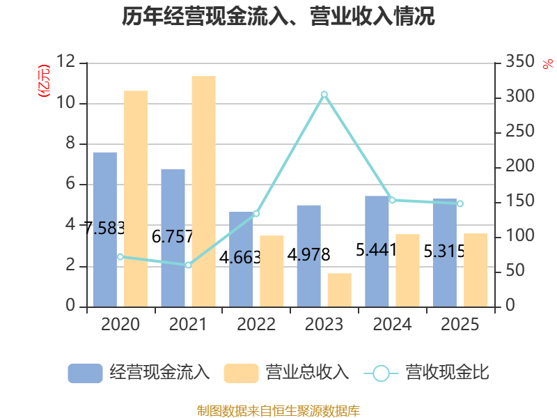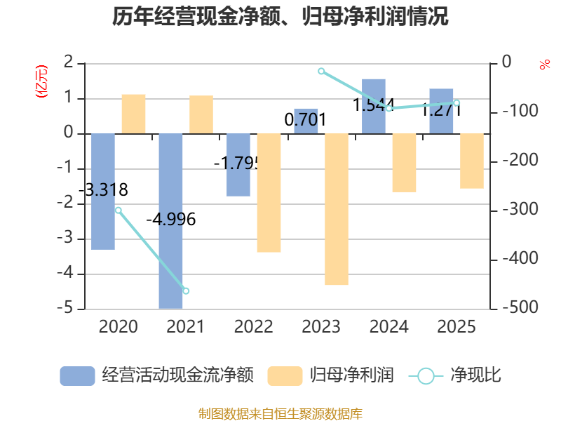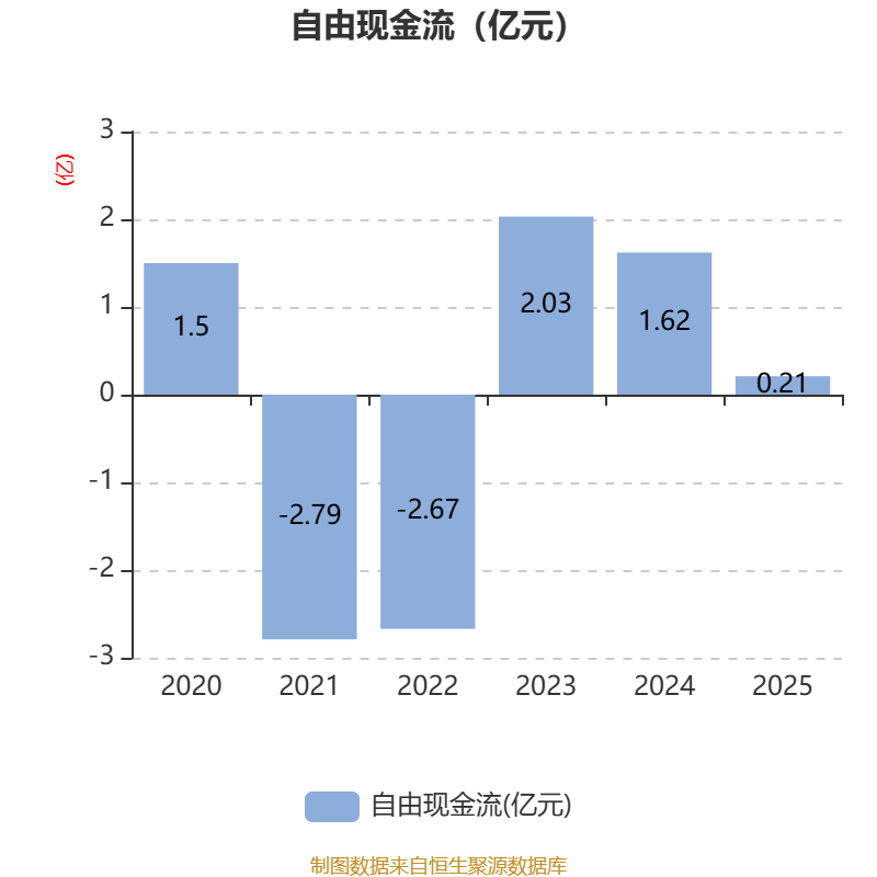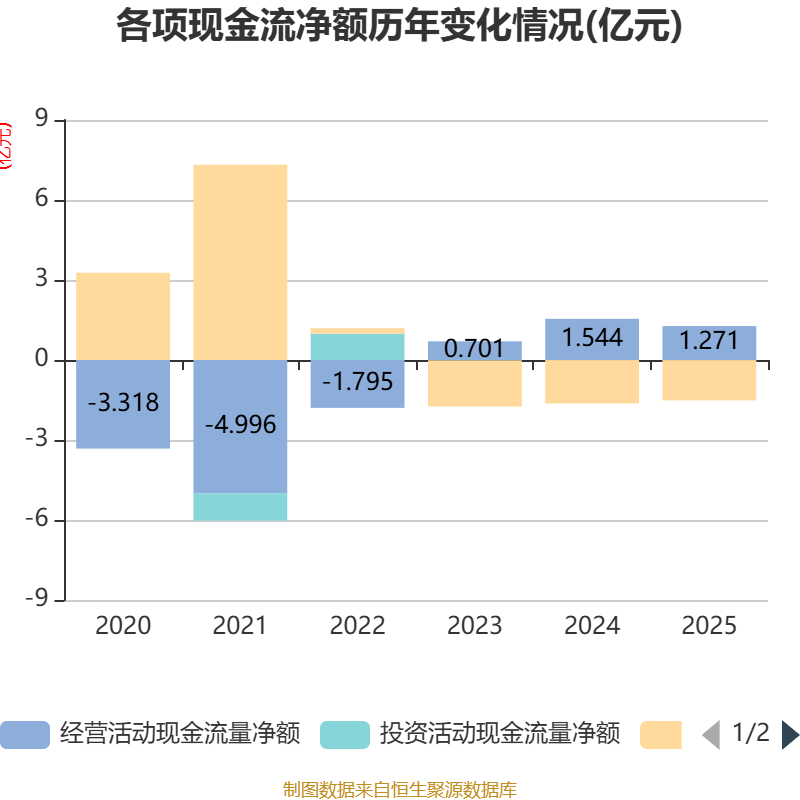 截至2025年,公司经营活动现金流净额为1.27亿元,同比下降17.69%;筹资活动现金流净额-1.51亿元,同比增加1150.63万元;投资活动现金流净额-26.11万元,上年同期为-16.4万元。