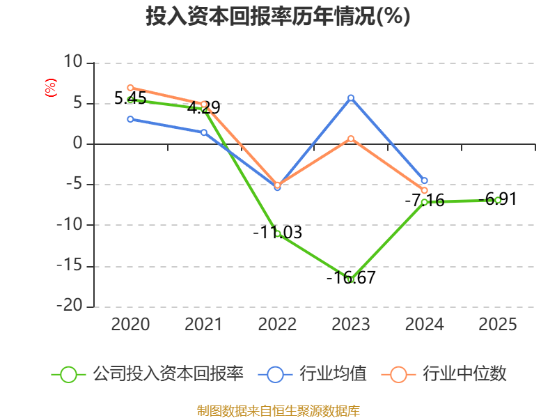 数据显示,2025年公司加权平均净资产收益率为-19.81%,较上年同期下降2.35个百分点。公司2025年投入资本回报率为-6.91%,较上年同期上升0.25个百分点。
