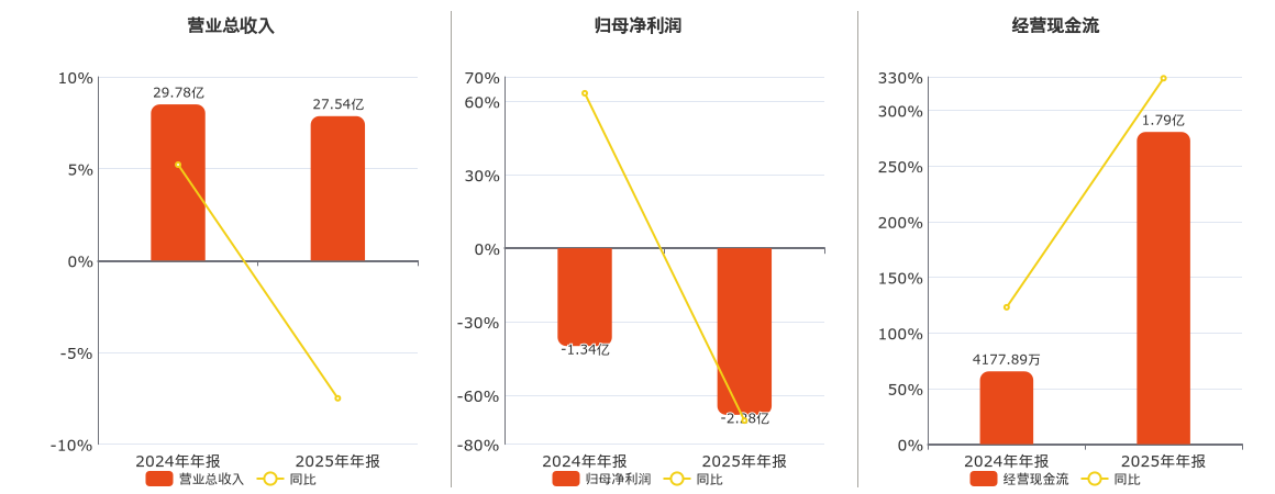 公司营业总收入为27.54亿元,较去年同报告期营业总收入减少2.23亿元,同比较去年同期下降7.50%。归母净利润为-2.28亿元,较去年同报告期归母净利润减少9411.18万元。经营活动现金净流入为1.79亿元,较去年同报告期经营活动现金净流入增加1.37亿元,实现2年连续上涨,同比较去年同期上涨328.72%。
