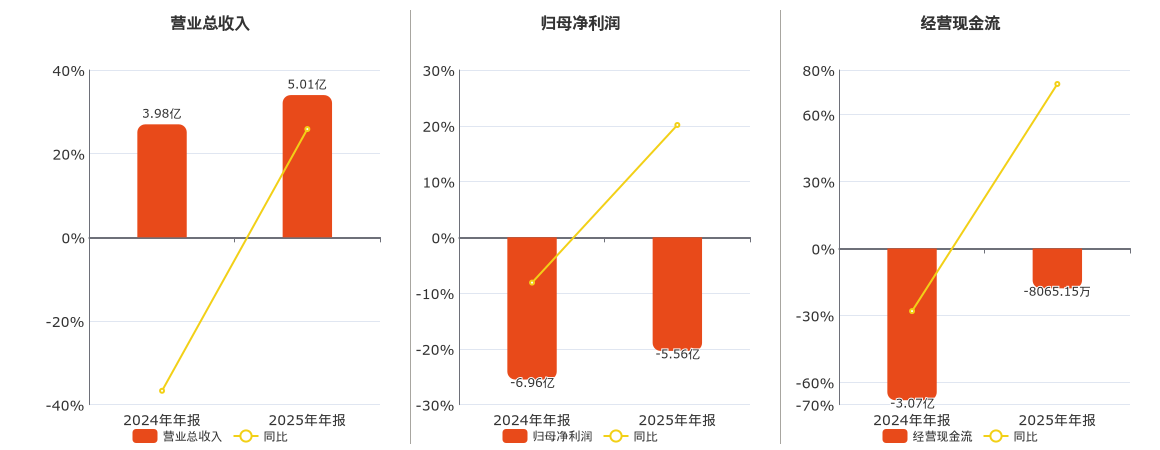 公司营业总收入为5.01亿元。归母净利润为-5.56亿元。经营活动现金净流入为-8065.15万元。