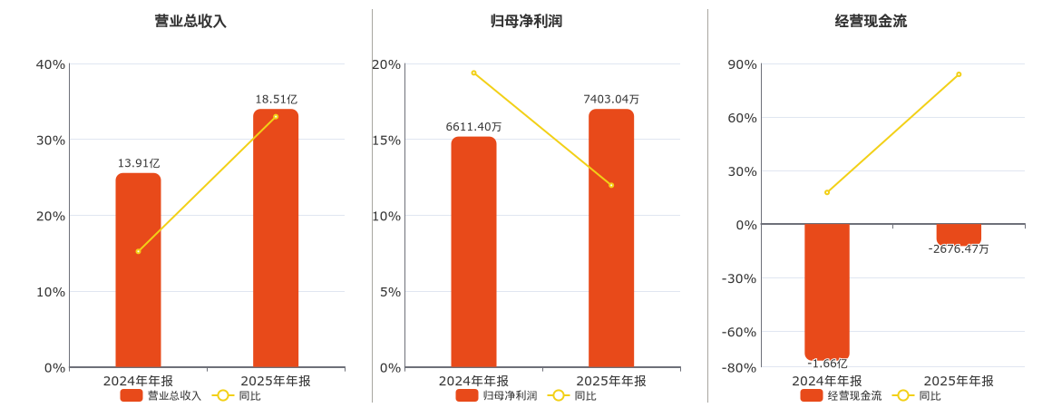 公司营业总收入为18.51亿元,在已披露的同业公司中排名第11。归母净利润为7403.04万元,在已披露的同业公司中排名第15。经营活动现金净流入为-2676.47万元,在已披露的同业公司中排名第18。
