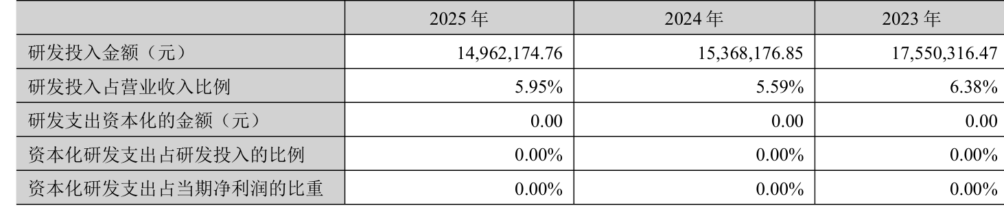 2025年全年,公司研发投入金额为1496.22万元,同比下降2.64%;研发投入占营业收入比例为5.95%,相比上年同期上升0.36个百分点。此外,公司全年研发投入资本化率为0%。